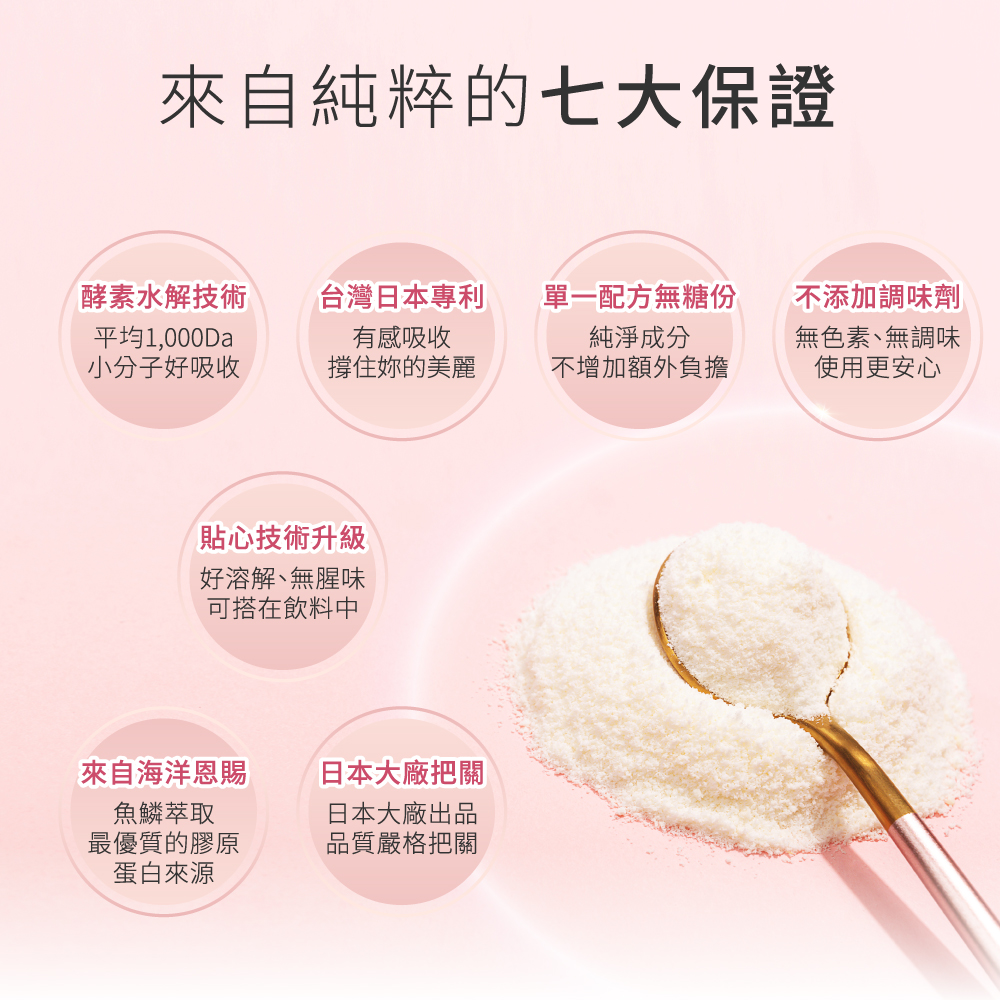 A:這是因為上瀧生技想要提供一款最單純吃的保養品,沒有其他多餘香料或是甜味的添加,可以任意加在想加的飲料湯品裡,最重要的是還用先進的技術把腥味降到最低,喝起來幾乎感覺不到膠原蛋白的腥味,是一款百搭粉劑