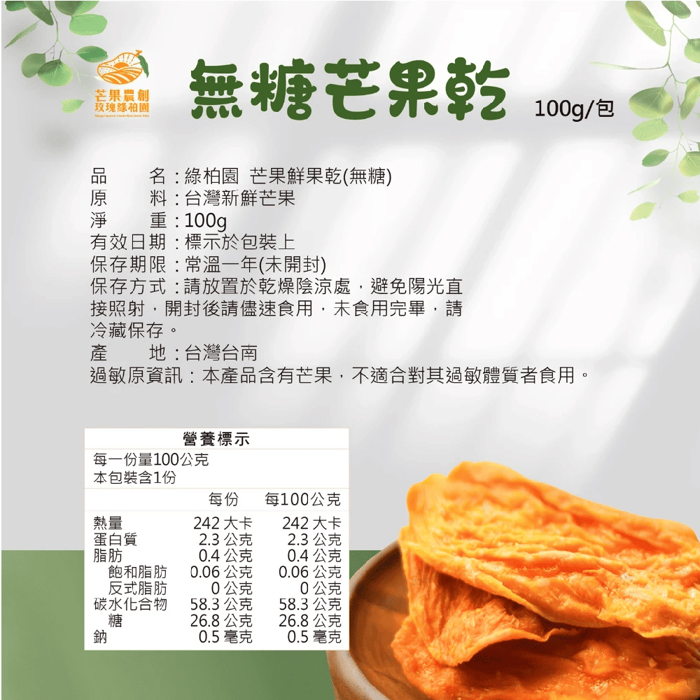 【綠柏園】無糖芒果乾(100g/包) 全新上市 / 低溫烘培 / 天然無加糖 / 老丁嚴選信心保證